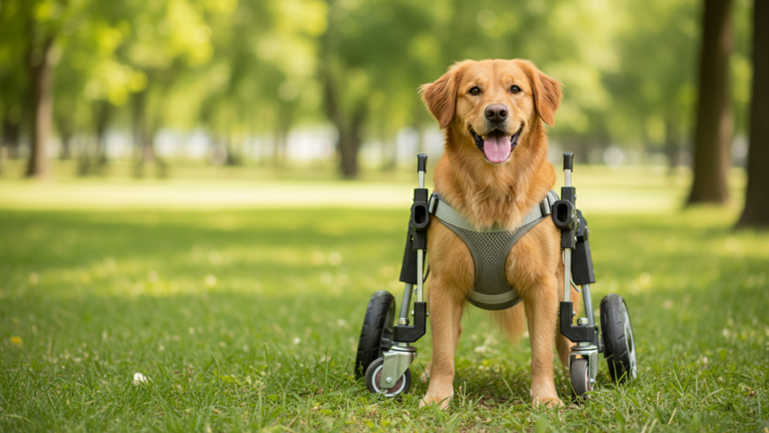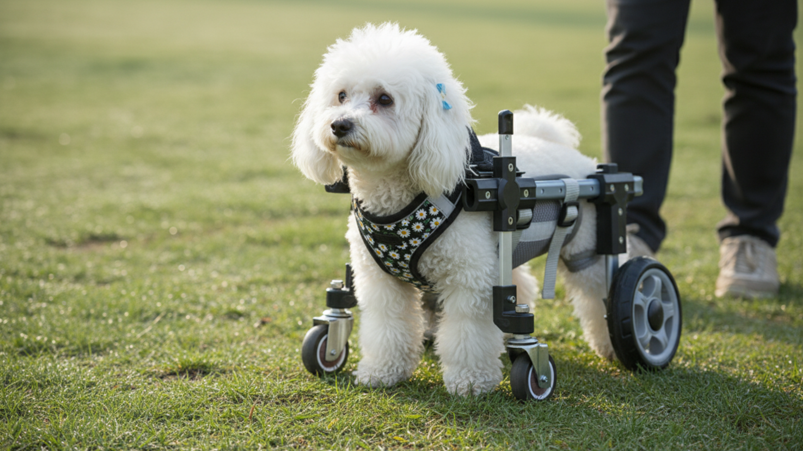 A 4-wheel dog wheelchair is a full support mobility cart for front and back legs. Unlike a 2-wheel dog wheelchair that mainly supports the rear legs, this 4-wheel design helps dogs who have weakness in both the front and back legs, or poor overall balance, by supporting the whole body with four wheels.