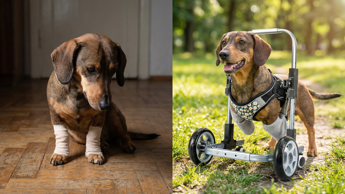 Adjustable 4-wheel dog wheelchairs and support gear to give weak front legs the help they need.